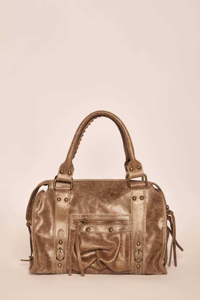 Bolso Madison Maxi en color camel · Confeccionado en piel de alta calidad y resistencia. Con detalles de tachuelas en oro viejo y flecos. Tiene forro y bolsillo interior. Puedes llevarlo como bolso de mano o como bandolera. Incluye correa larga regulable en el mismo material y color del bolso.